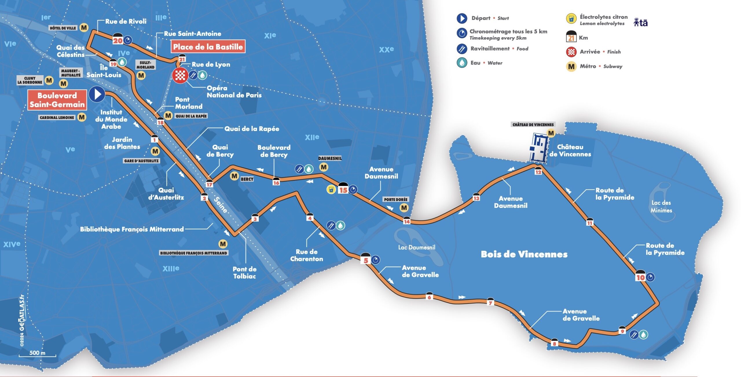 Le départ sera donné boulevard Saint-Germain, face à l’île Saint-Louis. Les coureurs longeront ensuite les quais en direction du pont de Tolbiac. Le tracé les conduira notamment devant Institut du Monde arabe, à travers le Jardin des Plantes, puis aux abords de la Bibliothèque François-Mitterrand. Après ce segment parisien, la course rejoindra Saint-Maurice via l’avenue de Gravelle avant de traverser le Bois de Vincennes et son château. Le retour s’effectuera vers l’Hôtel de Ville de Paris, par la rue de Rivoli et la rue Saint-Antoine, avec une arrivée place de la Bastille. Le profil demeure particulièrement roulant, avec seulement 66 mètres de dénivelé positif.